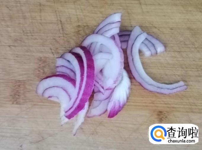 取新鲜的圆葱,先把圆葱剥皮,然后把圆葱用清水洗净,切去头尾,把圆葱切丝待用,我是炒菜时留了少许圆葱备用。