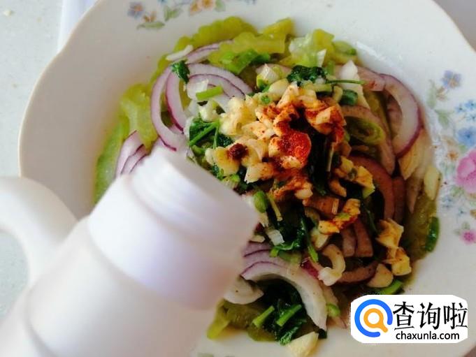 炒锅放油,油热后浇在,放好的辣椒面和蒜末上,随着热油的滋啦声,蒜香味特别浓郁,然后加上适量香醋和生抽,用筷子搅拌均匀,这样我们爽口的苦瓜拌圆葱就做好了,酸辣爽口特别好吃!
