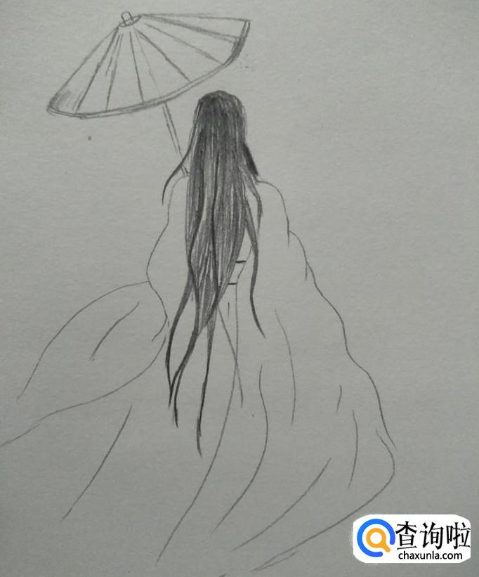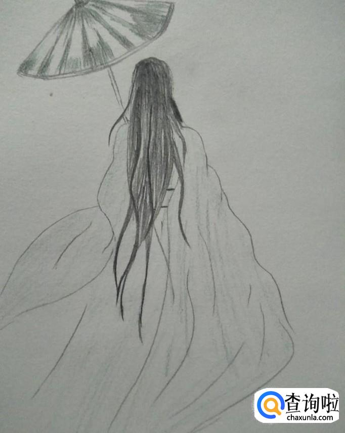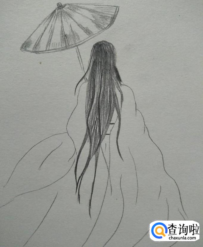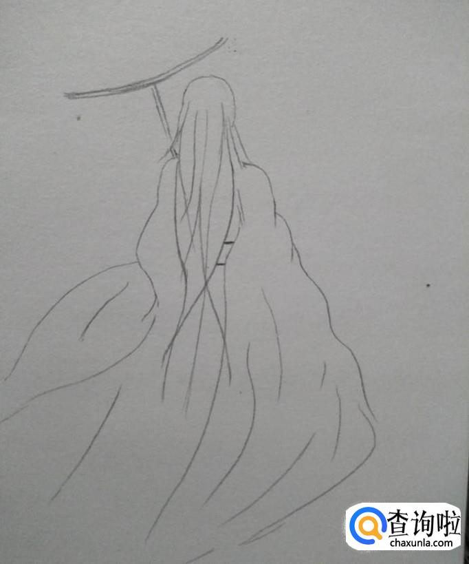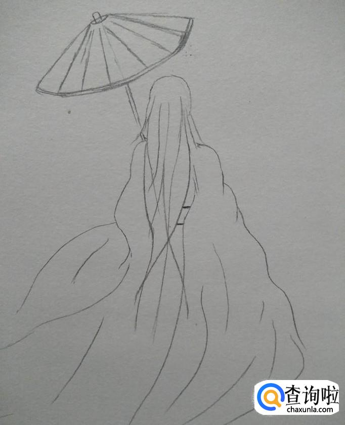 然后我们在左边头部上方画出伞柄,伞延,再顺着伞延画出伞身与伞尖,风格以油纸伞的样式来画,毕竟我们是画古典美女背影嘛!