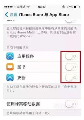 如果iPhone在使用时出现卡顿,那可能是因为它正在后台尝试应用升级,而这完全可以通过手动的方式执行。想要更改自动升级应用的设置,你需要进入【设置】-【iTunes Store和App Store】自动下载的项目,然后全部关闭。