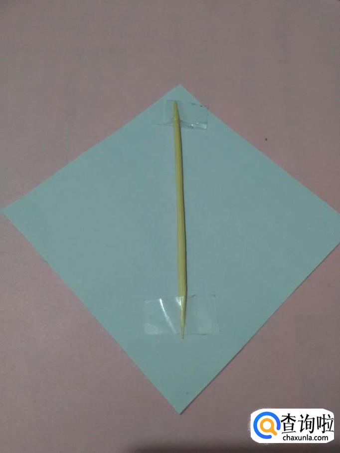 把一根竹签放在正方形的对角线上,用胶带固定两端。