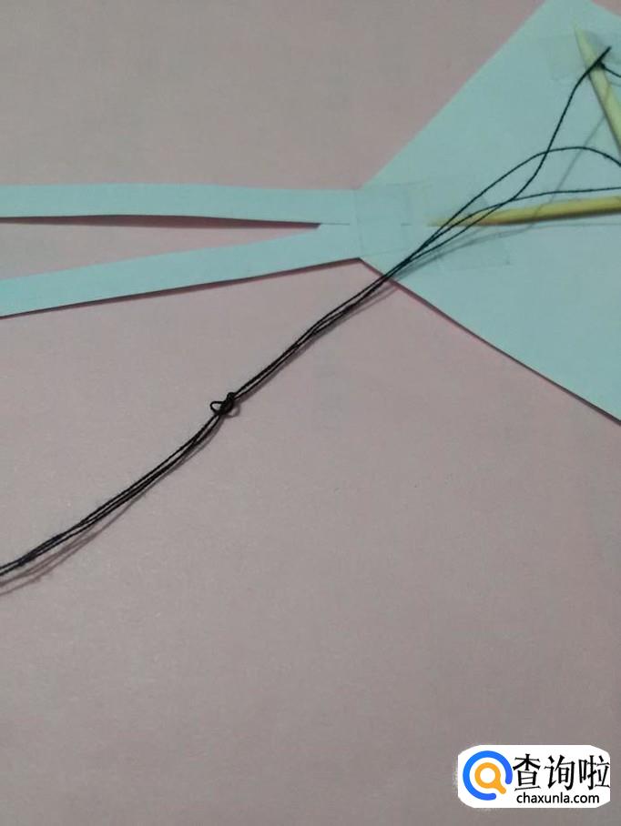 把三条线集中在一个点上,这个点拉起时,重心落在两条对角线的交叉点上,然后把三条线打一个结,在这个结之后,可以接上更长的风筝线,这样,简易风筝就做好了。