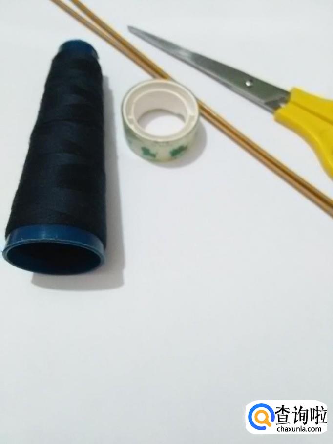 准备纸,竹签,胶带,剪,线。