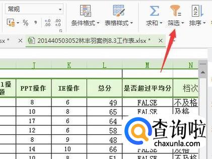 然后用鼠标选中成绩表下面的总标题栏,这里必须将横列那一栏标题全部选中,不然筛选可能会出问题。