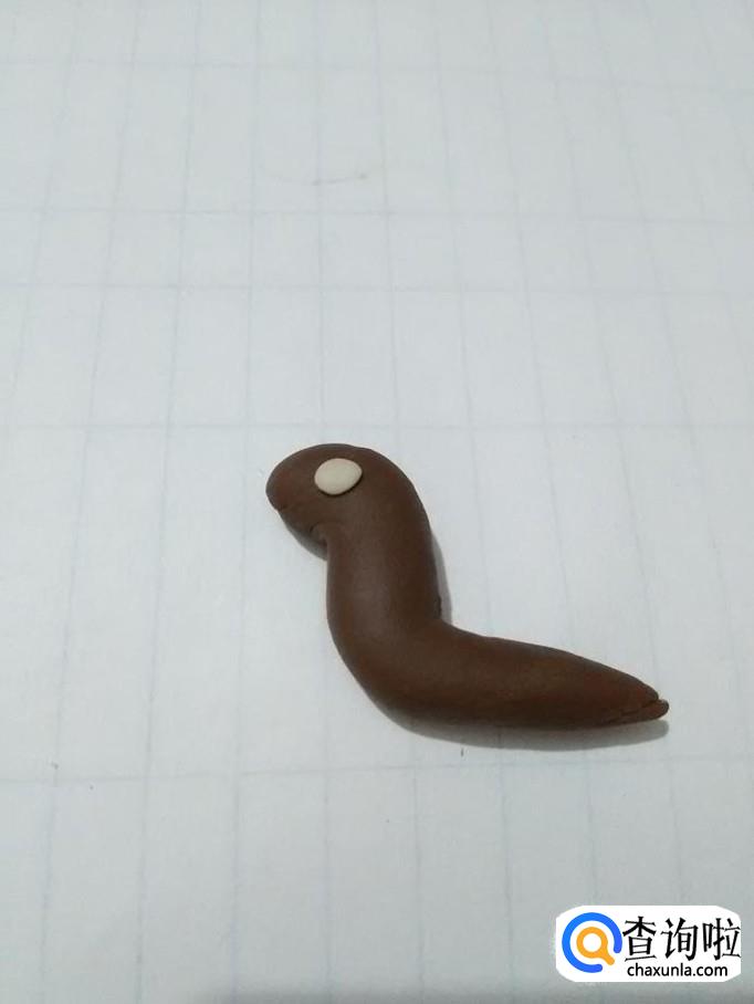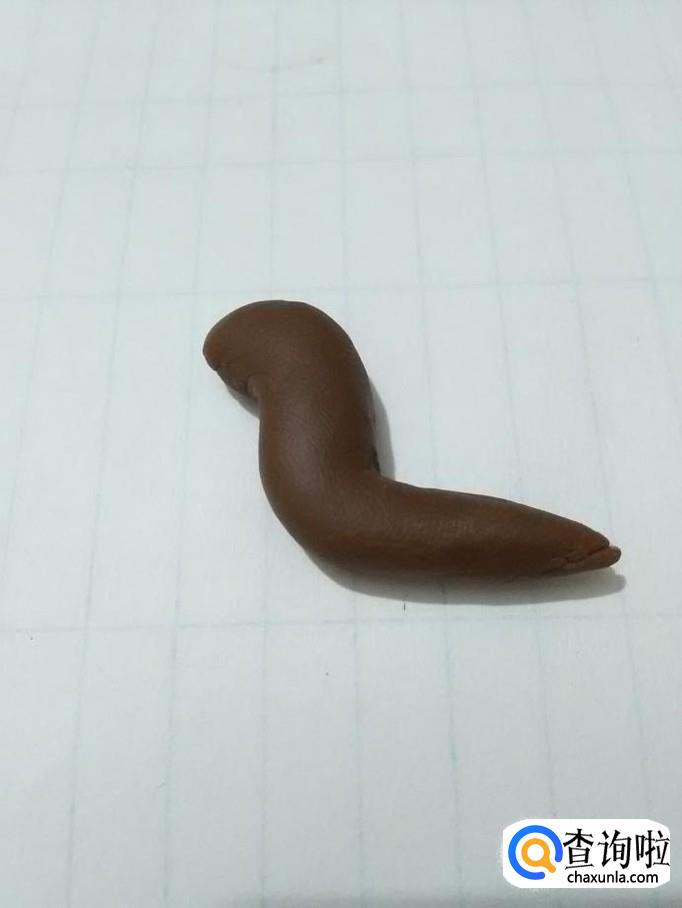 先将棕色橡皮泥搓成一头粗一头尖的长条,弯成2的形状,当做小蜗牛的身体。