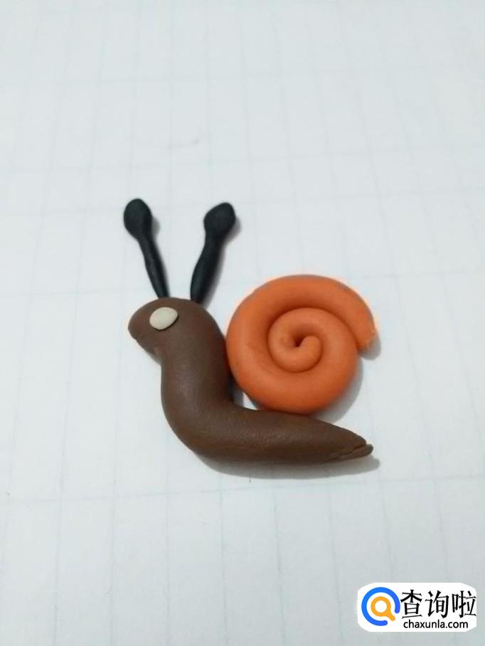 再用黑色搓两个小细条,末端用手捏成圆形,粘在蜗牛头部上方,当做两个触角,小蜗牛就做完了。