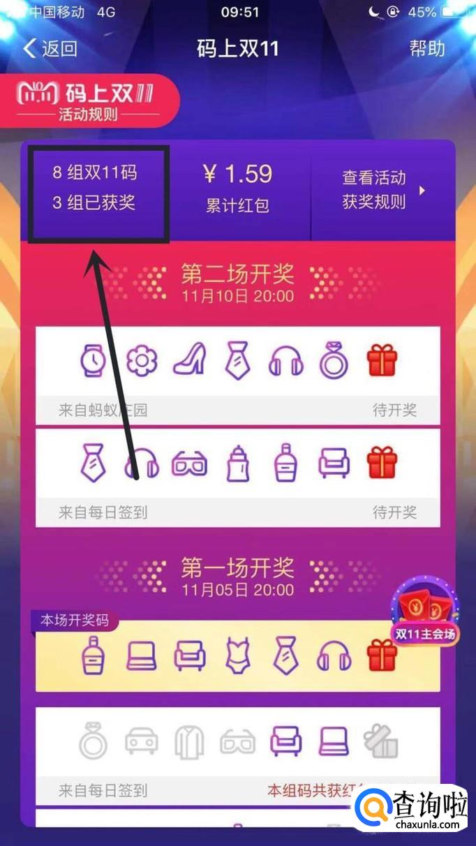 点击如下图的位置,可以查看到我们的攒码中了多少组以及具体的中奖情况。