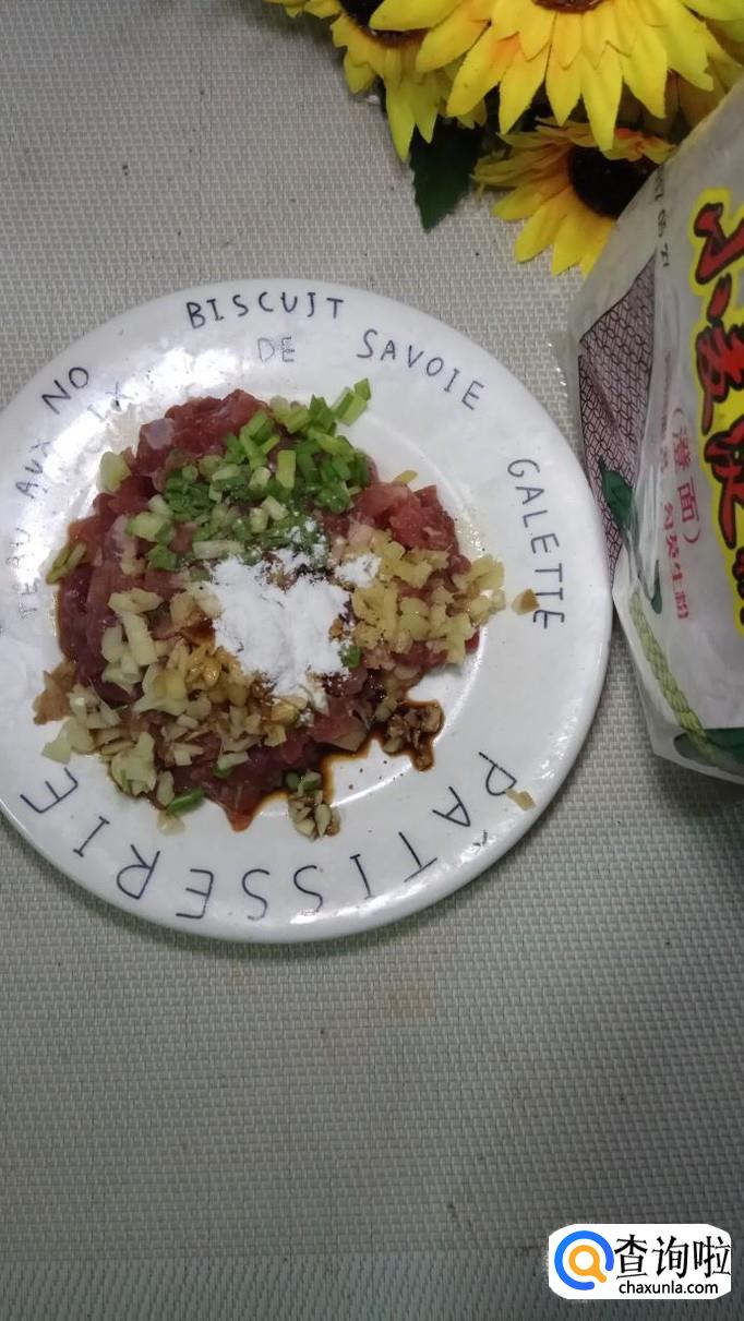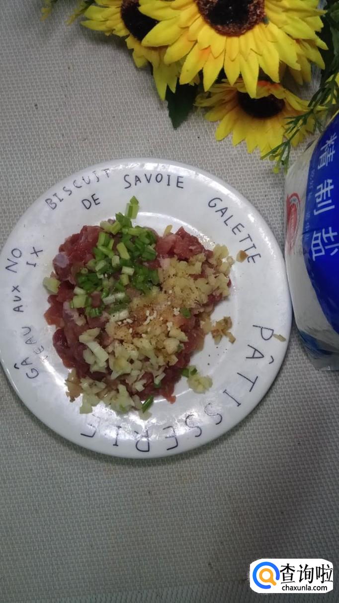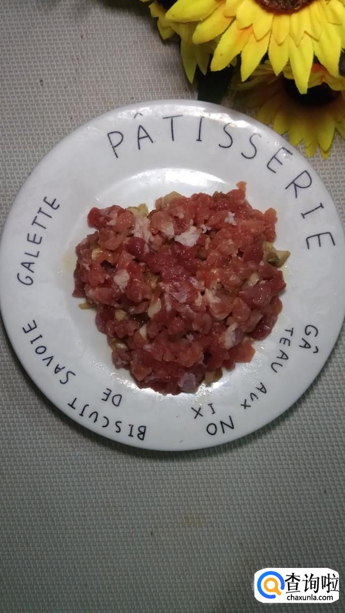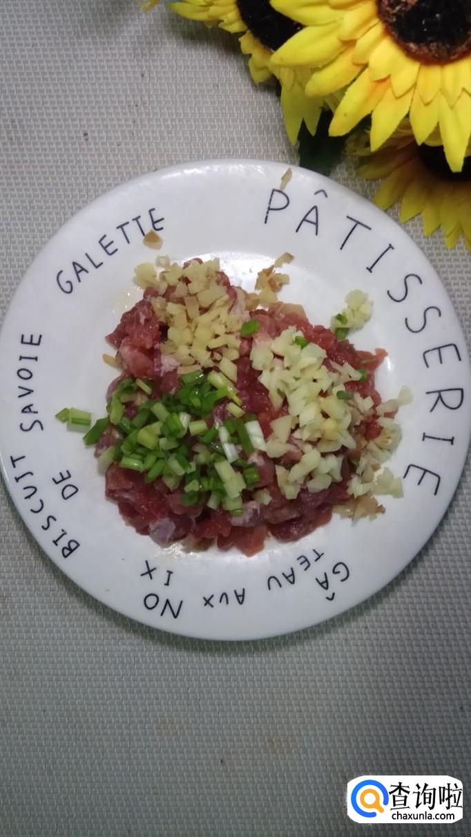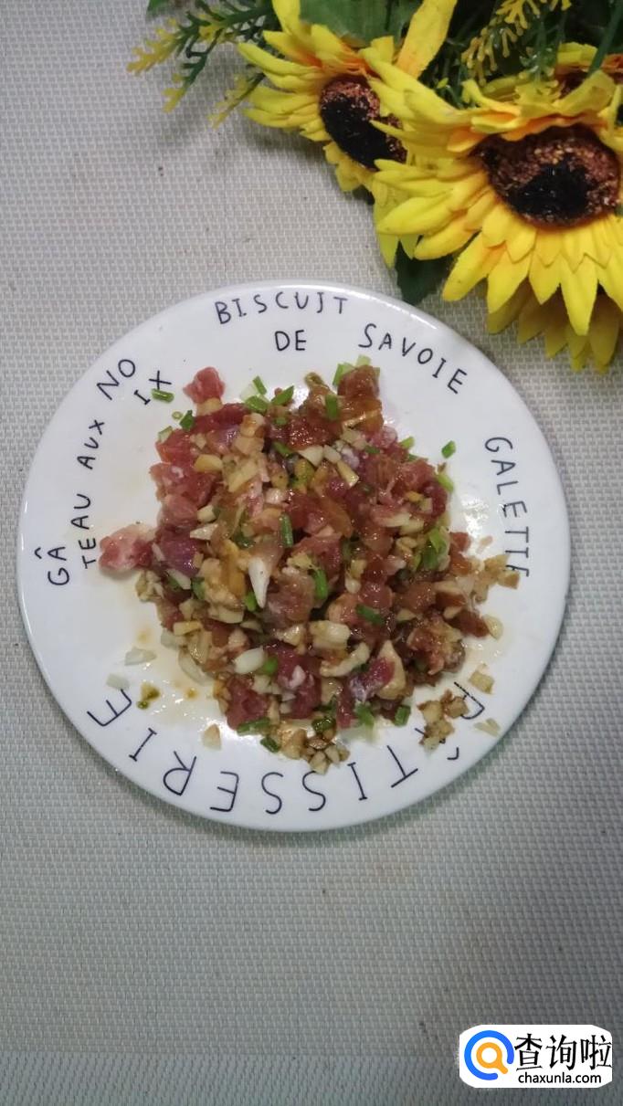 准备一块新鲜的五花肉,将五花肉洗净后切碎备用;然后再准备适量葱姜蒜,将它们分别切碎后放在盘中,这样可以有效去除五花肉的腥味。