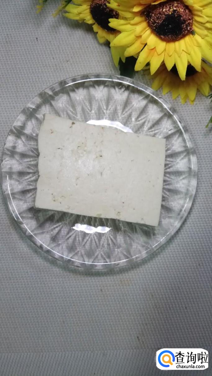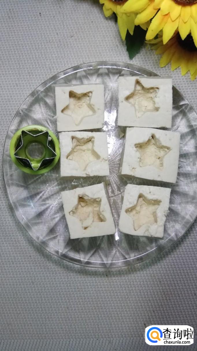准备一块老豆腐,将老豆腐切成大方块,然后用模具在中间挖出一个五角星,形成一个小洞。