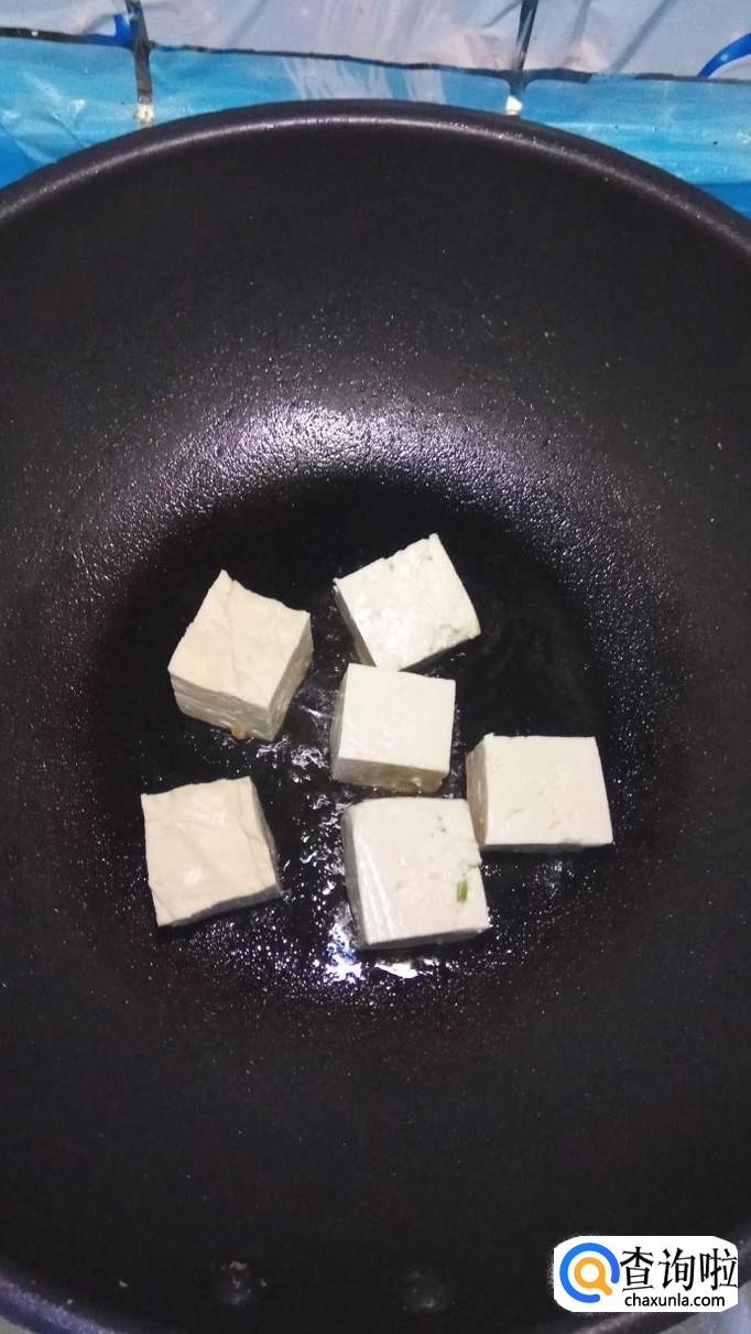 平底锅中放入适量油,油热后将做好的豆腐放入锅中,注意,洞口向下先放好,小火慢煎,煎至金黄后翻煎另一面。