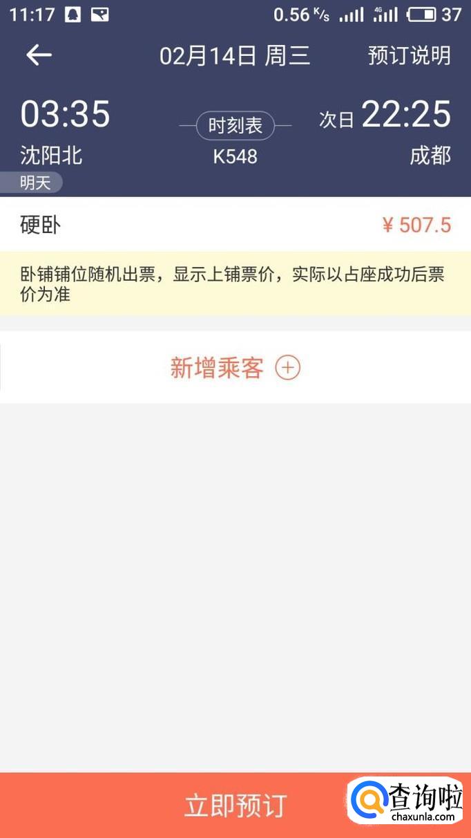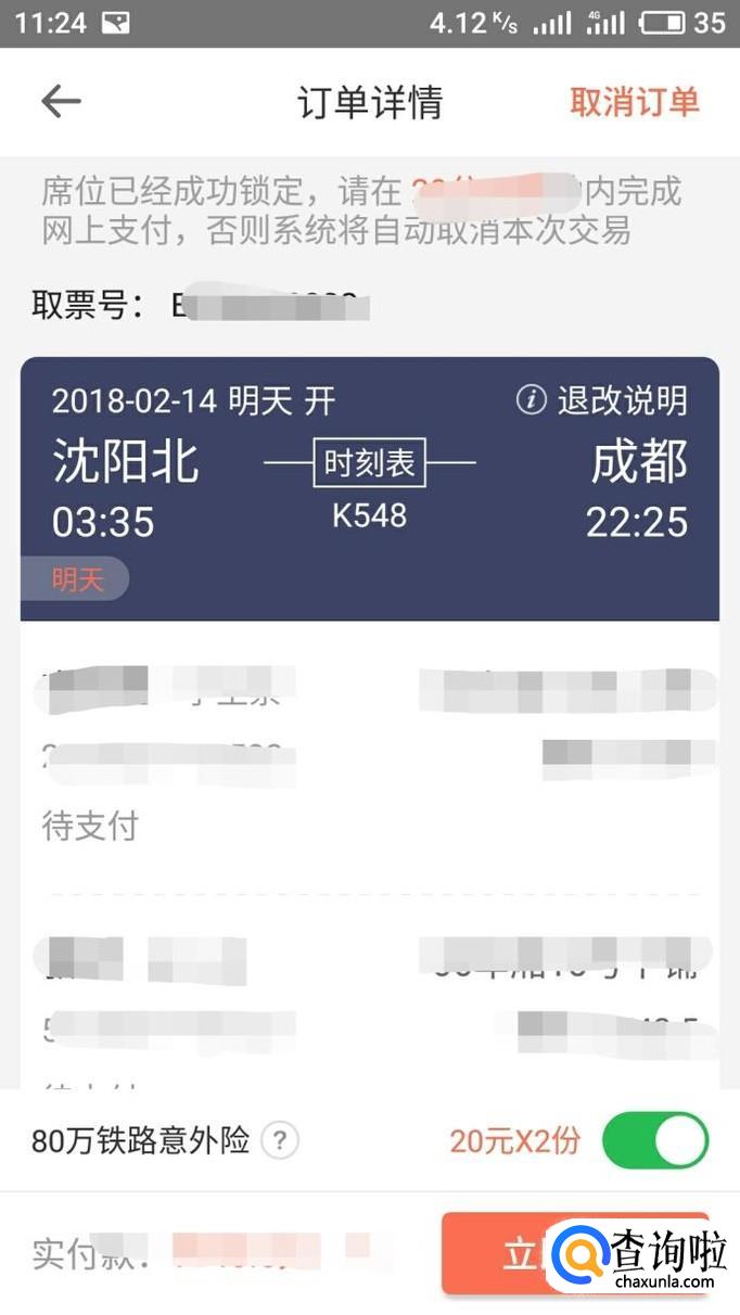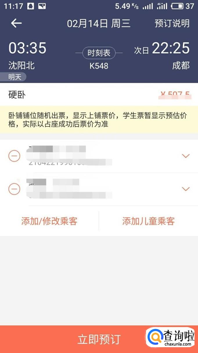 进入立即预定按钮后确认乘客信息和座位好,然后点击立即支付就订票成功了。