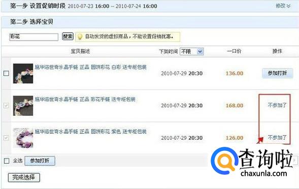 在选择宝贝时,如果“操作”中已经显示为“不参加了”则代表该类宝贝已经设置了打折,此时可点“不参加了”进行取消打折。
