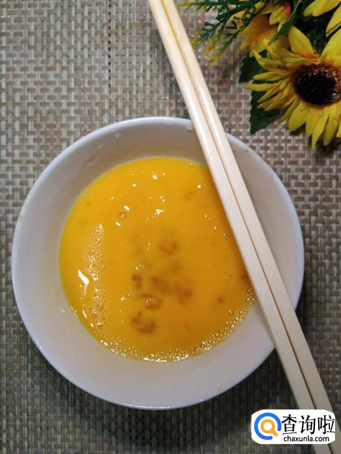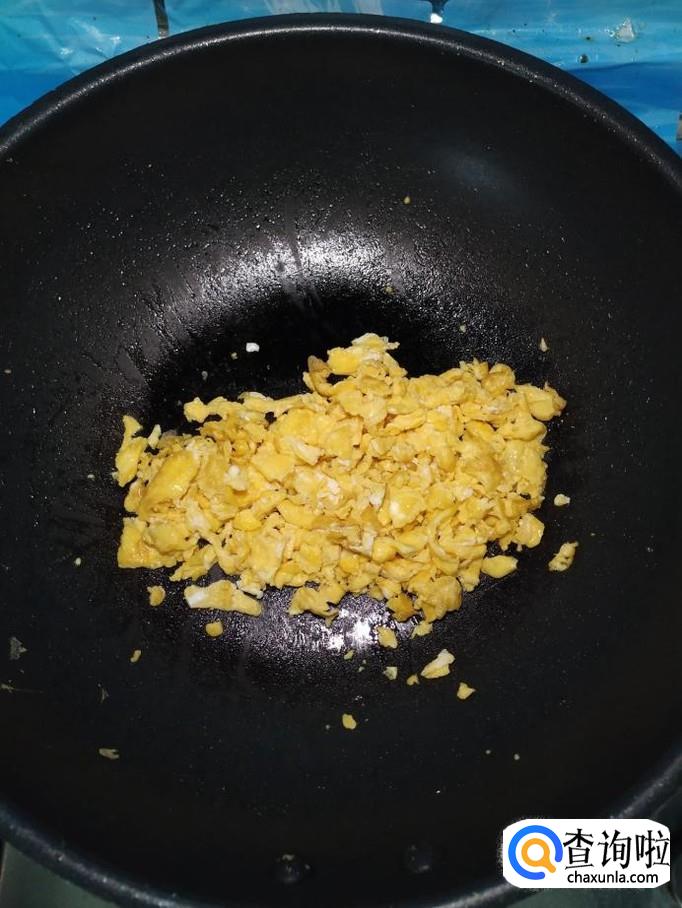 碗中打入两个鸡蛋,加入适量食盐,打散,锅中放入适量油,油热后,将鸡蛋放入锅中炒香,盛出备用。
