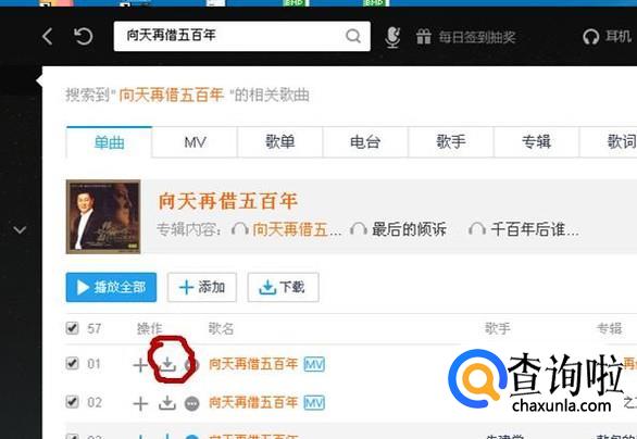 然后就会显示出这首歌曲得下载列表,点击歌曲前的下载标志(红圈所示)。