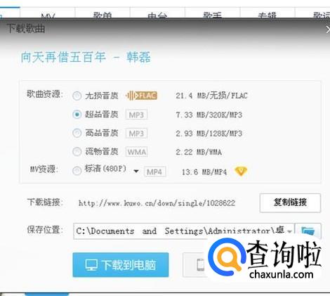 在弹出的对话框里选择好下载路径和音质,点击下面的“下载到电脑”就会开始下载了。
