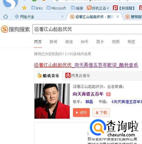 搜索到的网页上就会显示与这句歌词有关的歌曲,可以看到这句歌词是韩磊的“向天再借五百年”里的一句。