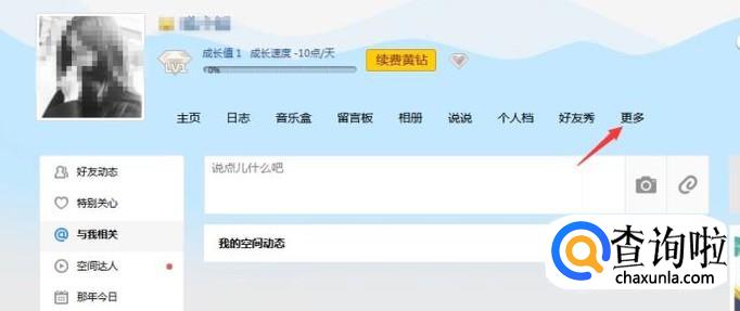 进入到空间后在空间栏目里点击最后一个“更多”功能。