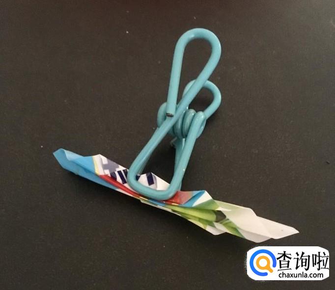 接着,用相同的方法,再折叠一张糖纸。折好后,可以用夹子夹住,或者其他东西压好。