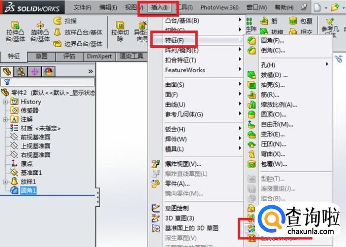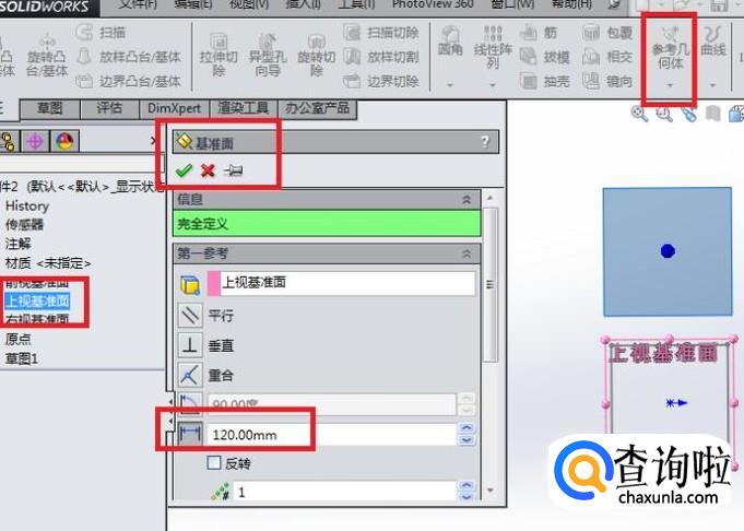 点击工具栏中的“参考几何体”图标下方的三角形,