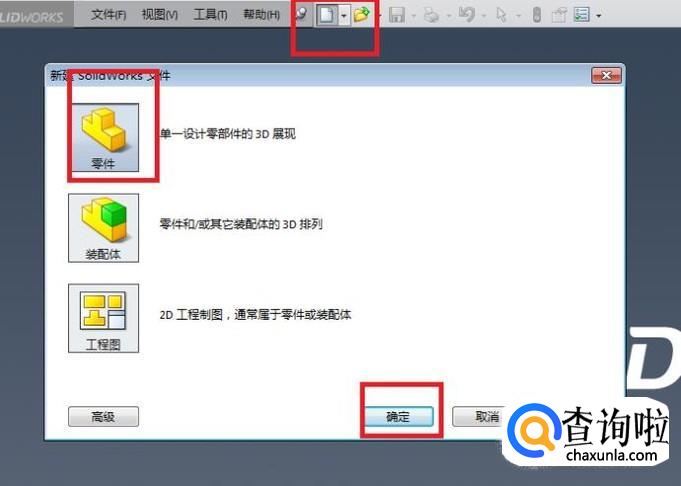 在随之出现的“新建SolidWorks文件”对话框中选择“零件”,
