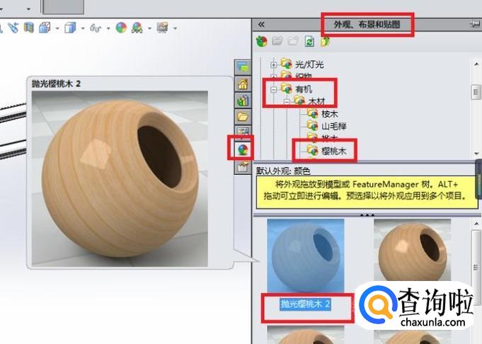 在弹出的“外观、布景和贴图”对话框中层层【有机-木材-樱桃木】,