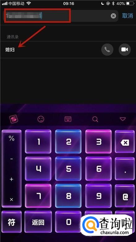 接着输入对方的手机号码并点击这个联系人,如下图所示。