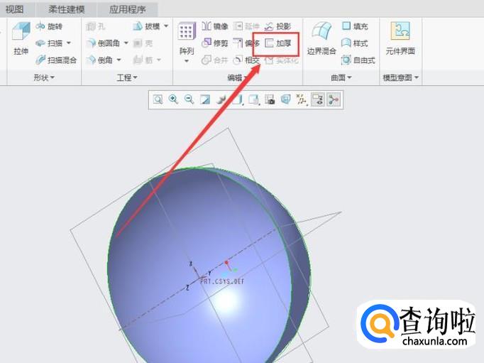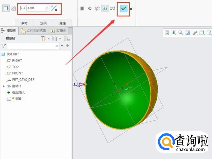 点击“加厚”功能键,将半球面的壁厚设置为4,如图所示。