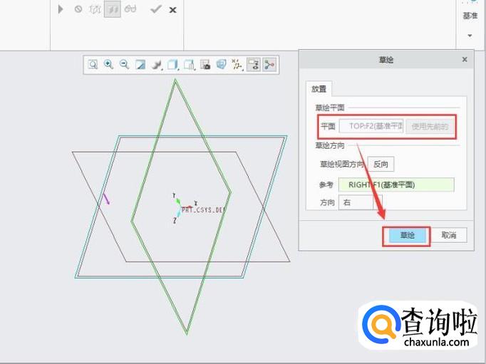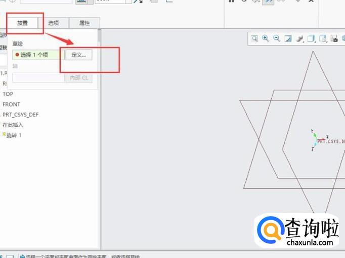 点击“放置”,然后点击“定义”,任意选择一个平面做为草绘平面,如图所示。