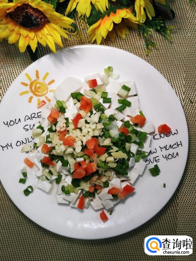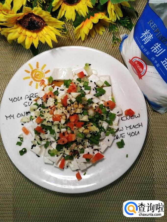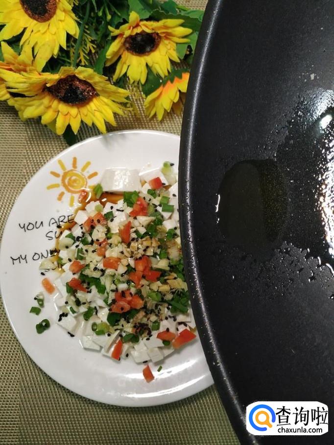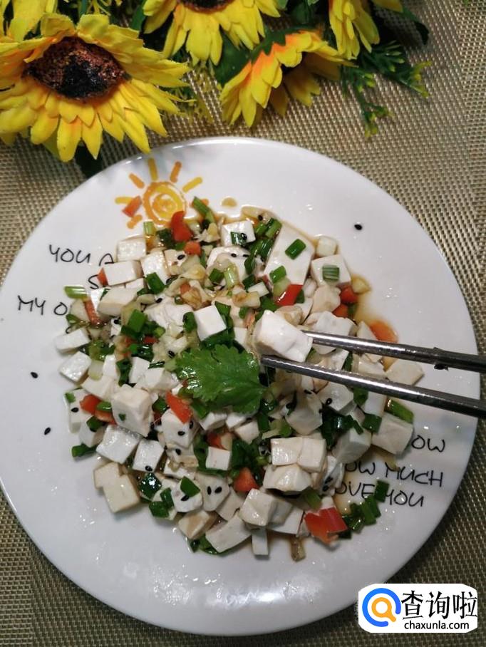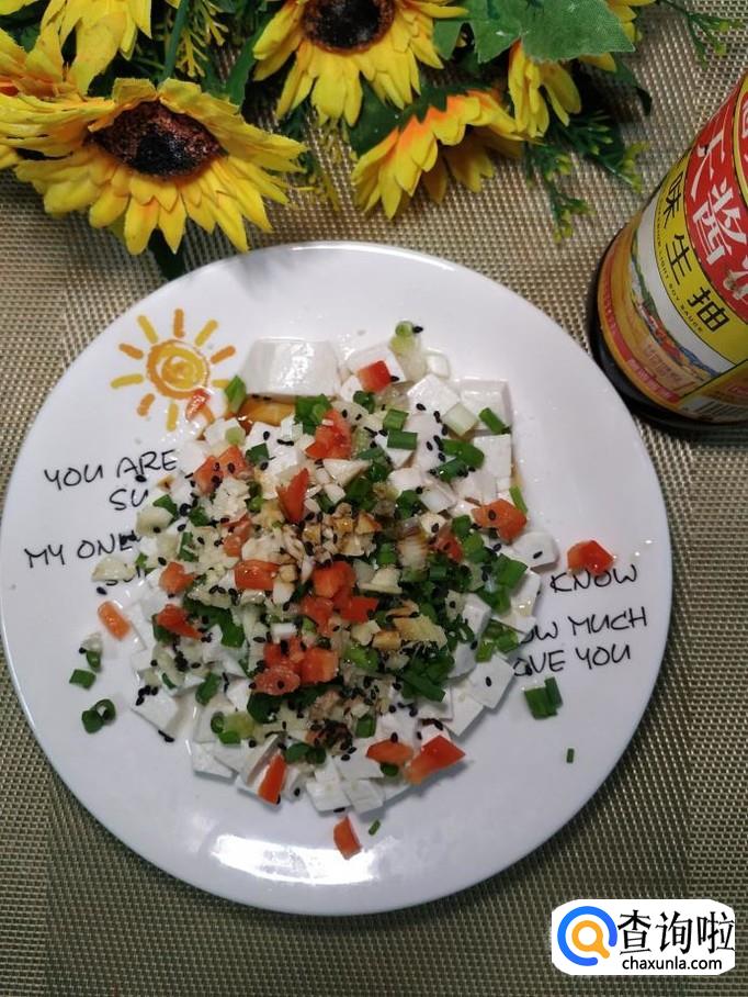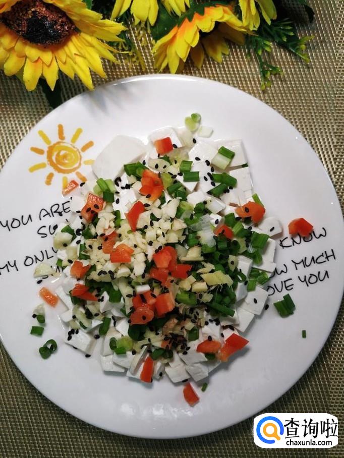 豆腐适量,小葱适量,姜适量,蒜适量,红椒适量,枸杞子适量,黑芝麻适量,香菜适量,盐适量,鸡精适量,生抽适量,香油适量。