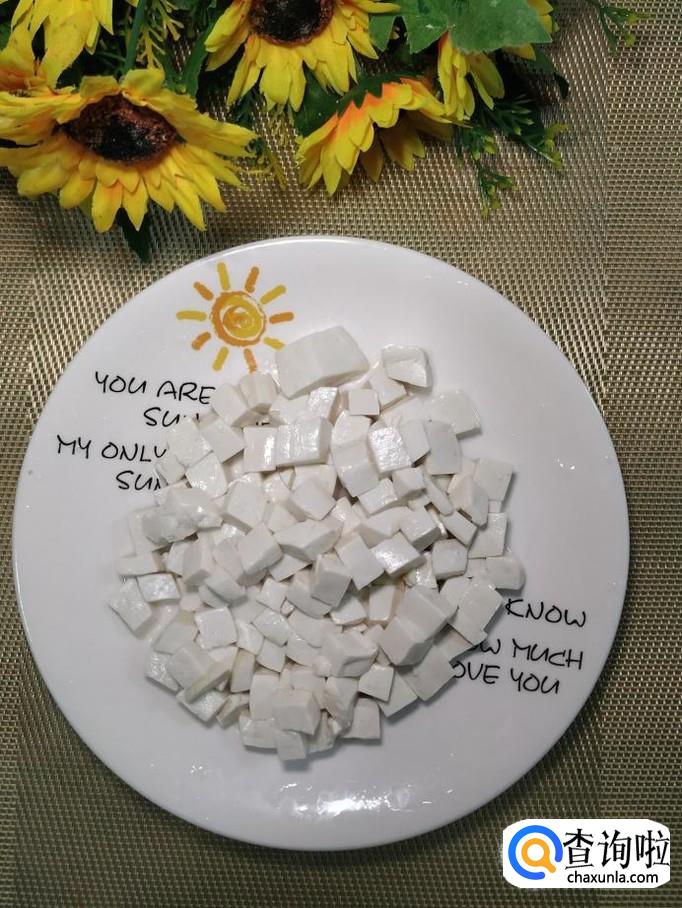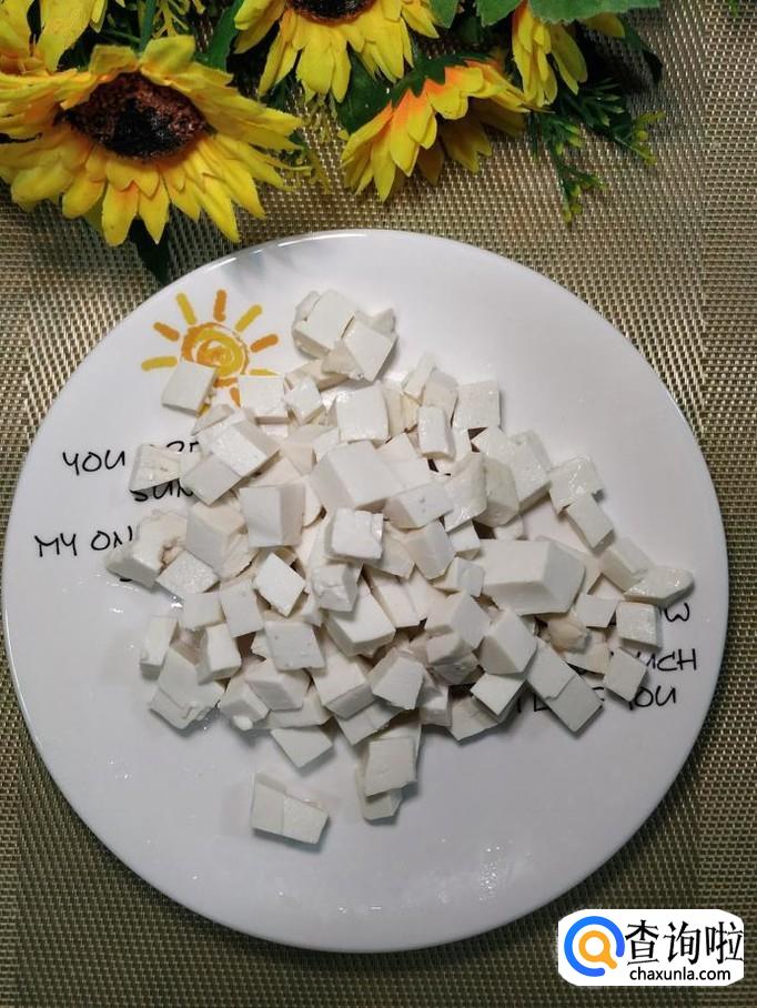 锅中烧开水,水开后将豆腐放入锅中焯水,焯好之后,捞出过凉水,放入盘中,控干水分备用。