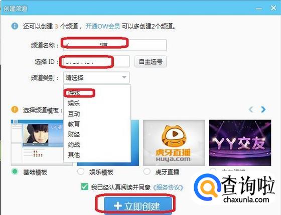 在弹出的“创建频道”选项框中,输入“频道名称”,选择ID及“频道类别”,点击“立即创建”。