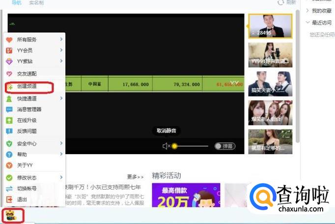 点击软件页面左下角图标,如图所示,在弹出菜单中选择“创建频道”。