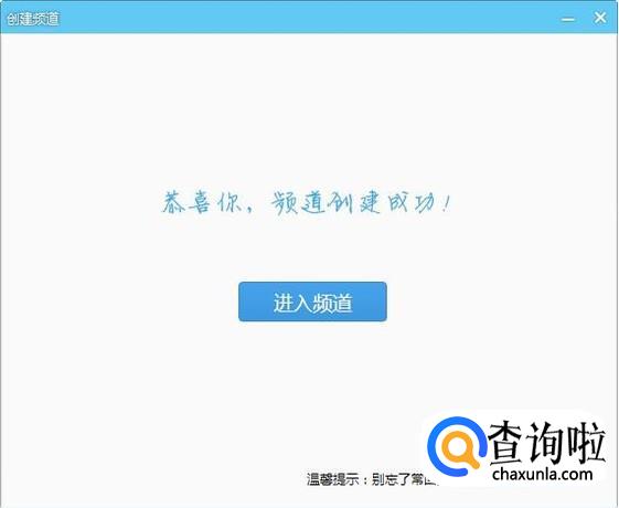 弹出频道创建成功的提示,点击“进入频道”就可以了,频道房间号创建完成。
