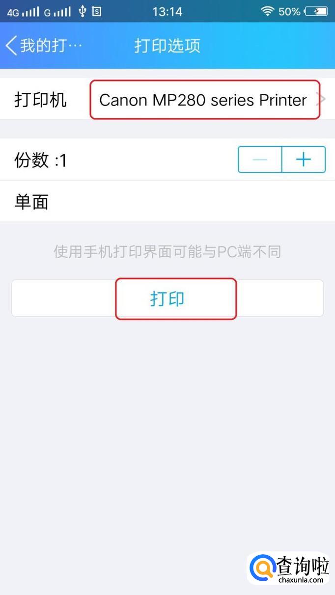此时,就进入了“打印选项”界面,如图所示,手机会自动识别打印机型号,我们只需点击“打印”就可以了。