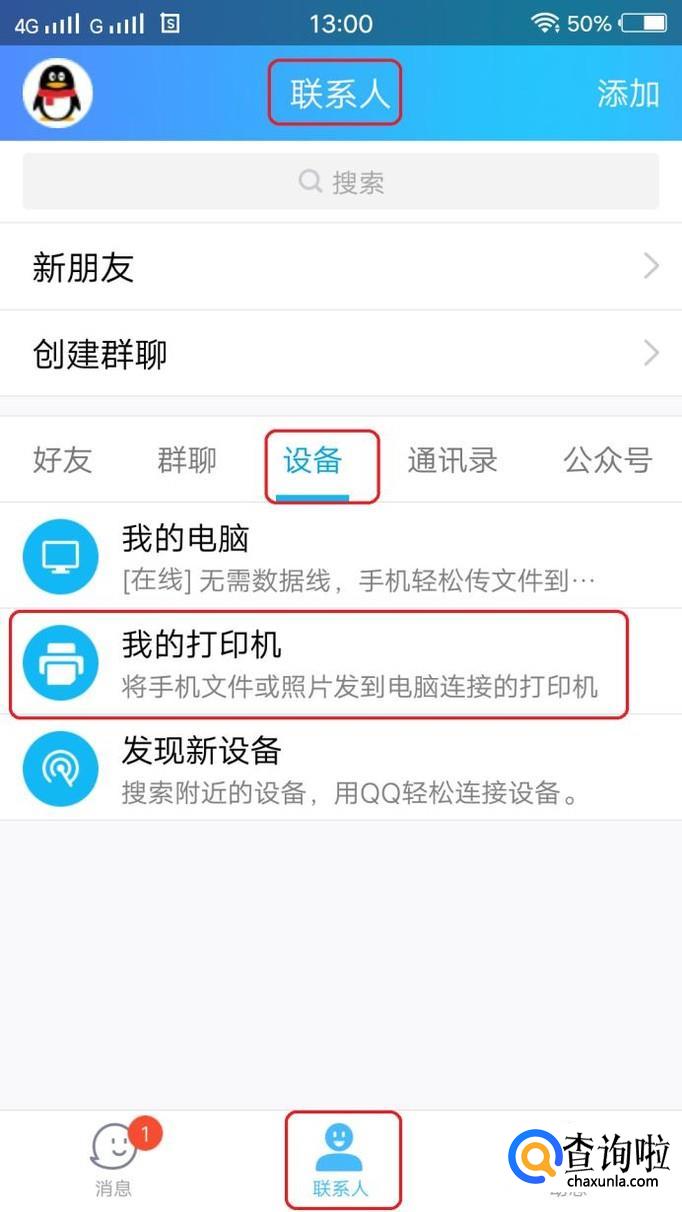 然后,我们点击手机QQ底部的联系人,然后点击中间位置的“设备”,就能看到“我的打印机”选项了,我们点击进入。
