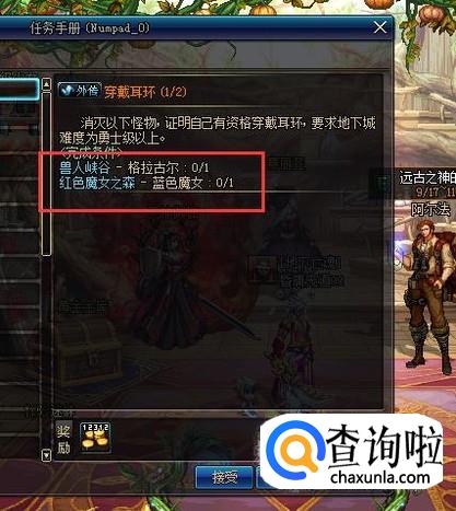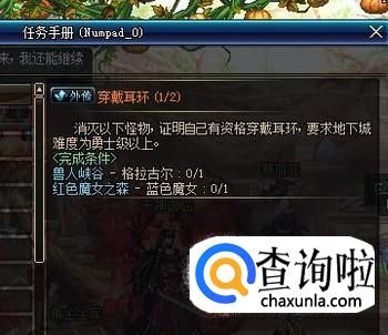 这时候来到魔界营地的地图把兽人峡谷和红色魔女之森难度选择勇士级以上全部通关一次就可以完成这个穿戴耳环的任务了
