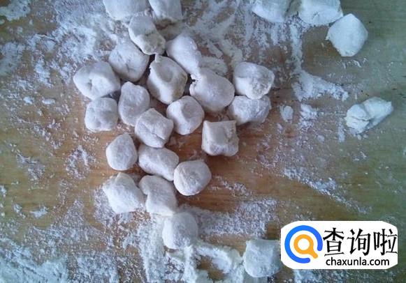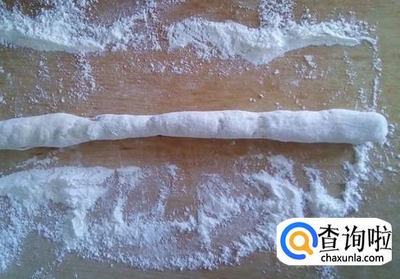 将面圈拽断成条状,接着在面板上双手按揉面条使它更圆一些,然后揪成饺剂子。