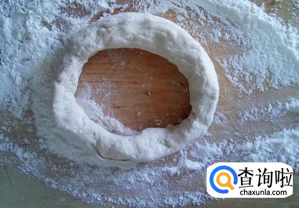 准备好面板,放上少许布面,将醒发好的面团揉成圆饼状后从中间开个孔,不断抻揉成面圈。