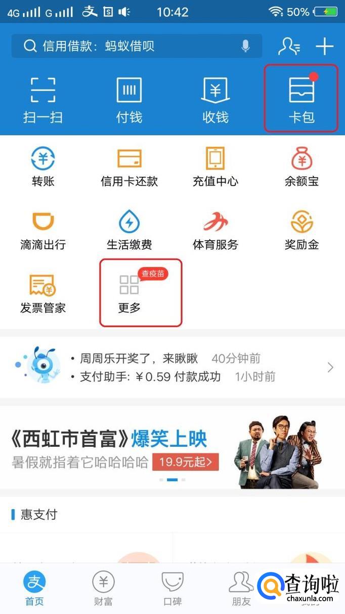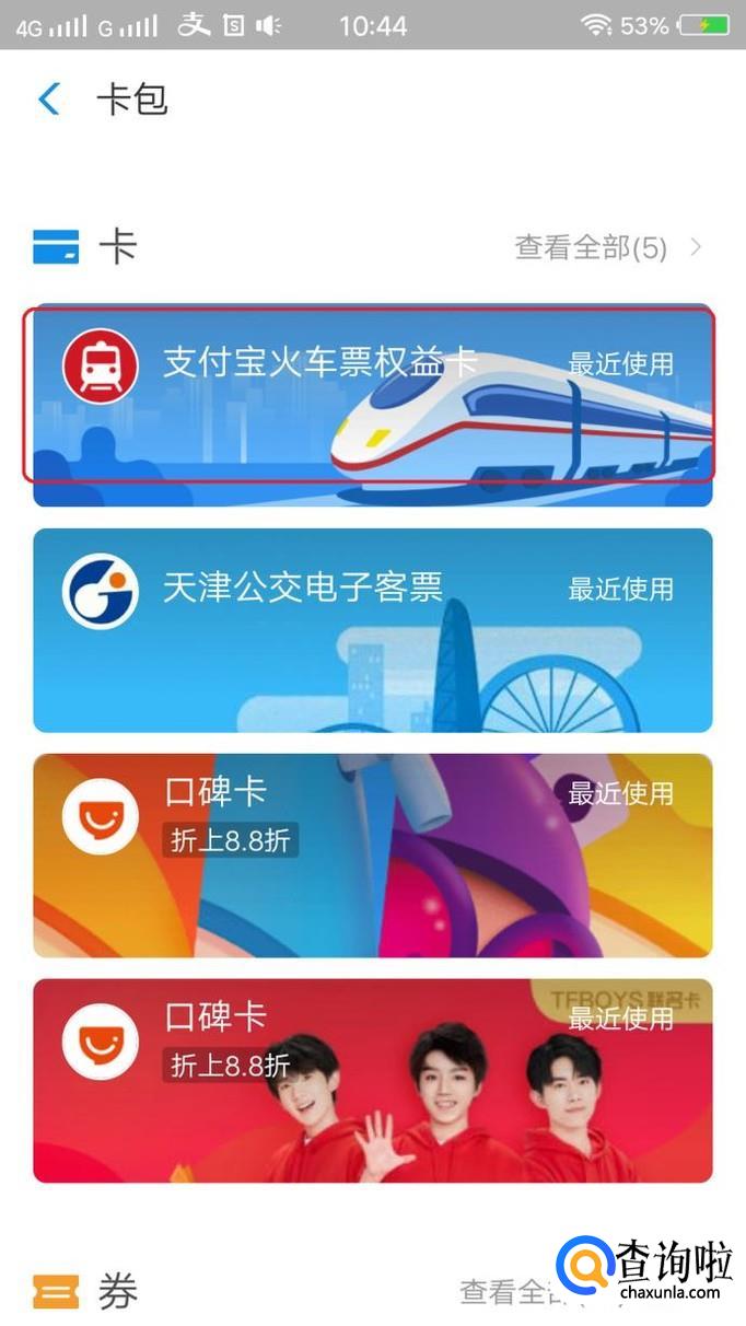 买完火车票以后,卡包里就会增加“支付宝火车票权益卡”,进入卡包的方法如步骤1图中所示,我们进入卡包以后,如图所示,点击该权益卡。
