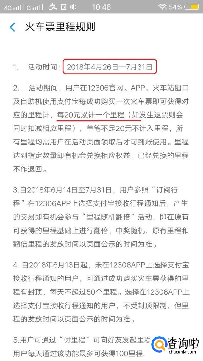 里程怎么得到呢?我们可以看一下活动规则,可以看到,活动期间购买火车票,每20元累计一个里程。
