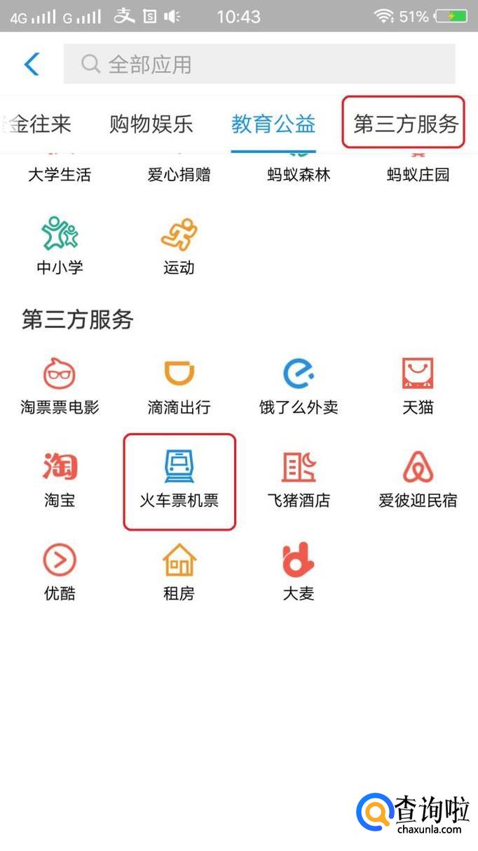 然后,在下一页面的“第三方服务”中,就能看到“火车票机票”了,点击进去以后,绑定12306账号,就能买火车票。