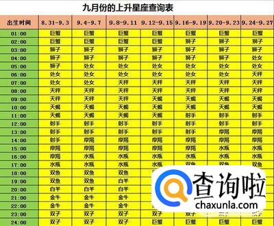 出生日期为九月份(8月31日-9月27日)的上升星座查询表,例如出生日期是9月4日下午4点15分,那么根据下面的表格,红色和绿色部分的表格对应,得出上升星座为上升水瓶座。