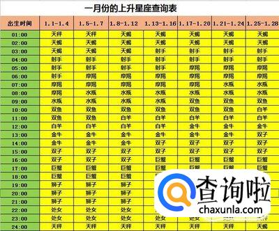出生日期为一月份(1月1日-1月28日)的上升星座查询表,例如出生日期是1月4日下午4点15分,那么根据下面的表格,红色和绿色部分的表格对应,得出上升星座为上升双子座。