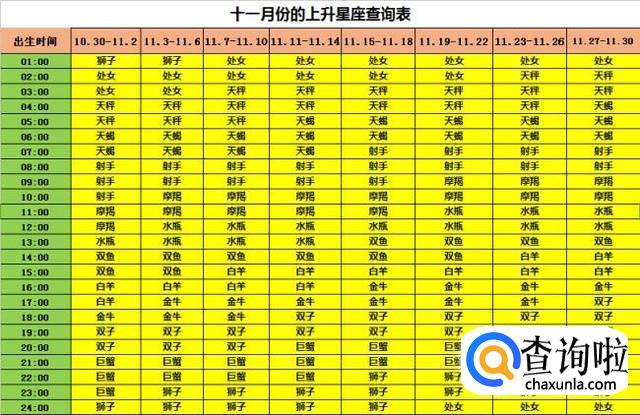 出生日期为十一月份(10月30日-11月30日)的上升星座查询表,例如出生日期是11月4日下午4点15分,那么根据下面的表格,红色和绿色部分的表格对应,得出上升星座为上升白羊座。