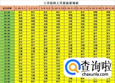 出生日期为三月份(2月26日-3月29日)的上升星座查询表,例如出生日期是3月4日下午4点15分,那么根据下面的表格,红色和绿色部分的表格对应,得出上升星座为上升狮子座。