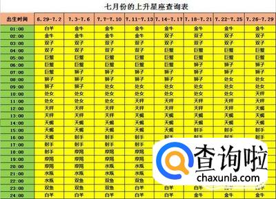 出生日期为七月份(6月29日-7月29日)的上升星座查询表,例如出生日期是7月4日下午4点15分,那么根据下面的表格,红色和绿色部分的表格对应,得出上升星座为上升射手座。
