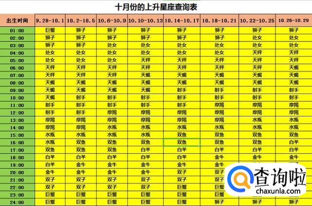 出生日期为十月份(9月28日-10月29日)的上升星座查询表,例如出生日期是10月4日下午4点15分,那么根据下面的表格,红色和绿色部分的表格对应,得出上升星座为上升双鱼座。