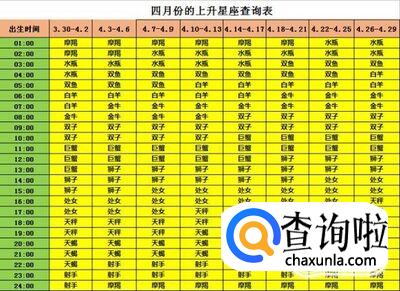 出生日期为四月份(3月30日-4月29日)的上升星座查询表,例如出生日期是4月4日下午4点15分,那么根据下面的表格,红色和绿色部分的表格对应,得出上升星座为上升处女座。
