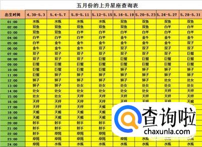 出生日期为五月份(4月30日-5月31日)的上升星座查询表,例如出生日期是5月4日下午4点15分,那么根据下面的表格,红色和绿色部分的表格对应,得出上升星座为上升天秤座。