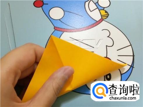 将它两边的角折叠回来,成两个小的三角形,再把它放回到原处,轻轻地将将它揭起来,按照刚才的折叠的线将它轻轻的按下去。